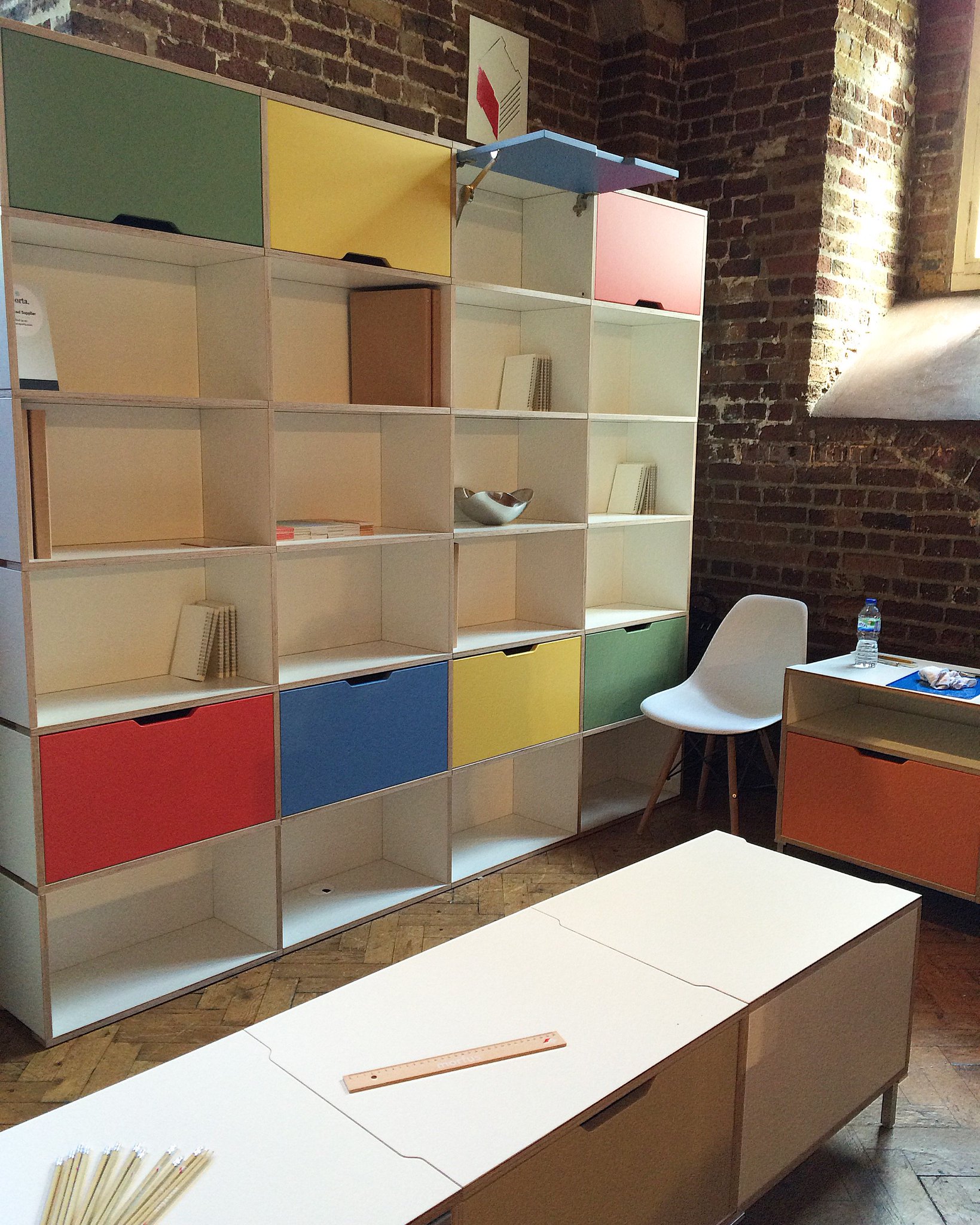 A range of simple, elegant and robust modular storage units. This British company uses sustainable northern European birch plywood for the units, which are manufactured in Derbyshire. According to the manufacturer, two trees are planted for each one that is used, so that all the CO2 involved in the production of the furniture and the shipping of the raw materials is sequestered. There are quite a few makers of modular furniture, but Morphus are particularly attractive, and I was impressed by their concern for sustainability. The man with the coffee in the picture below is the designer and founder of the company, Tim Williams.